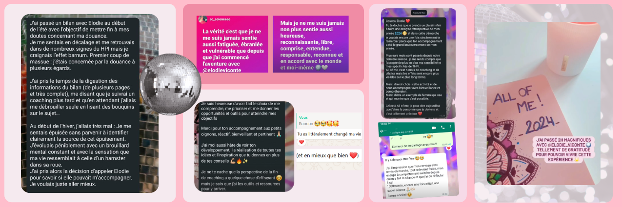 Après avoir fait plusieurs autres choses entre thérapie, psychologie et hypnose, le bilan d’exploration de douance m’a beaucoup appelée car je me rendais compte que c’est ce qui me manquait pour clôturer cet approfondissement de moi-même. »